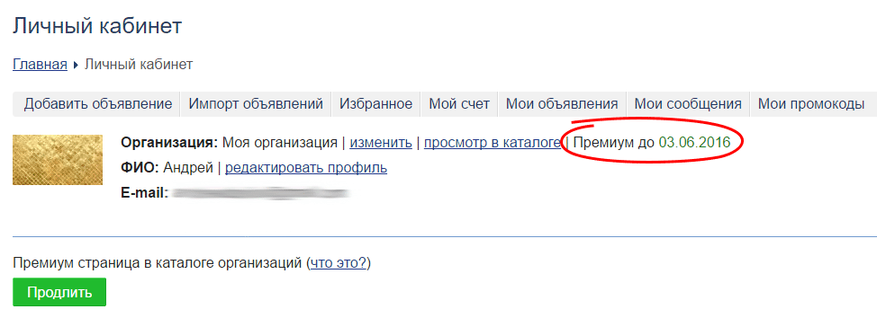 В личном кабинете напротив наименования организации Вы увидите до какого числа активна премиум страница.