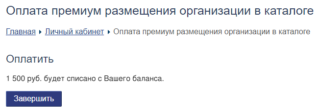 Следуйте инструкциям на сайте платежного шлюза (Яндекс.КАССА). При успешном завершении оплаты, указанная сумма переведется на Ваш баланс и будет использована оплаты/продления премиум страницы в каталоге организаций.